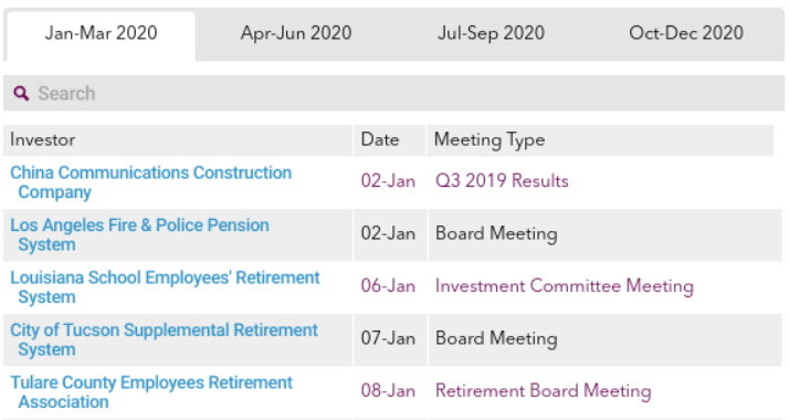 Available to subscribers only, the calendar is regularly updated, and features meetings for the current quarter as well as the three subsequent quarters.